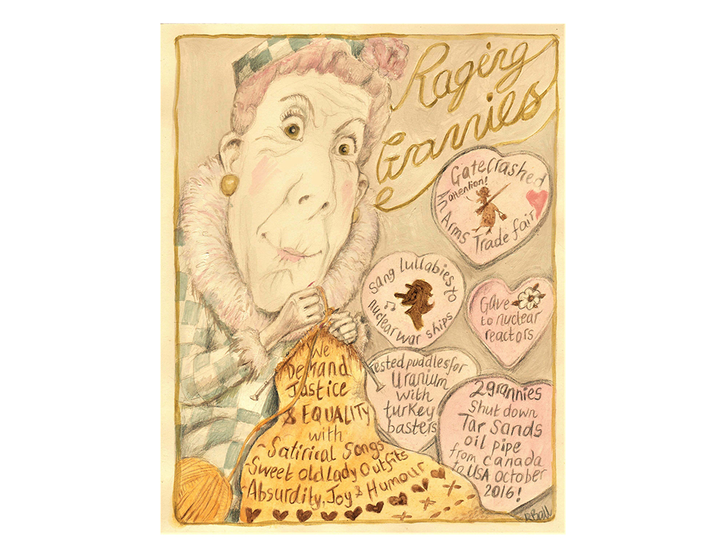 According to Raging Grannies International, “The delights of grannying include: dressing like innocent little old ladies so we can get close to our ‘target’, writing songs from old favourites that skewer modern wrongs, satirising evil-doing in public and getting everyone singing about it[…]. Grannying is the least understood yet most powerful weapon we have.”
